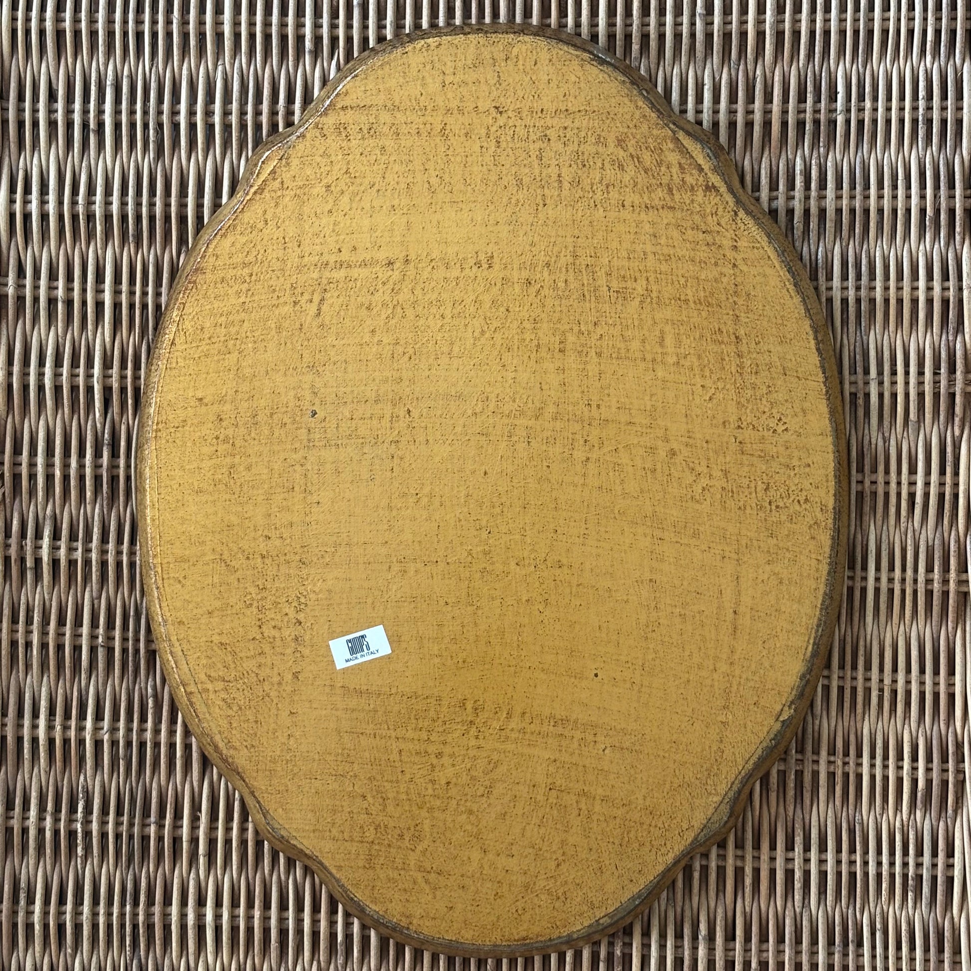 This Italian Wood Gold Tray features a painted gold finish with a distinctive painted green edge, exemplifying classic Italian craftsmanship. It includes a minor imperfection—a very small spot where the paint has worn off—adding to its character. Sold by Gump's.