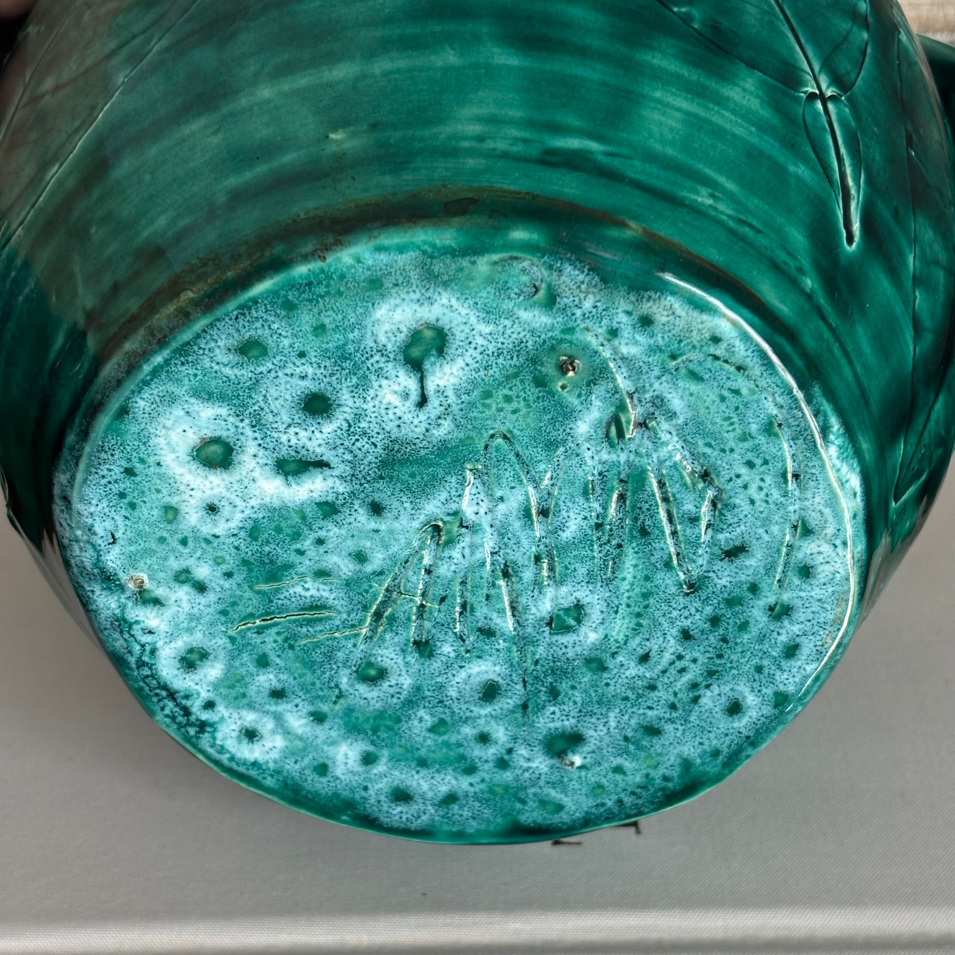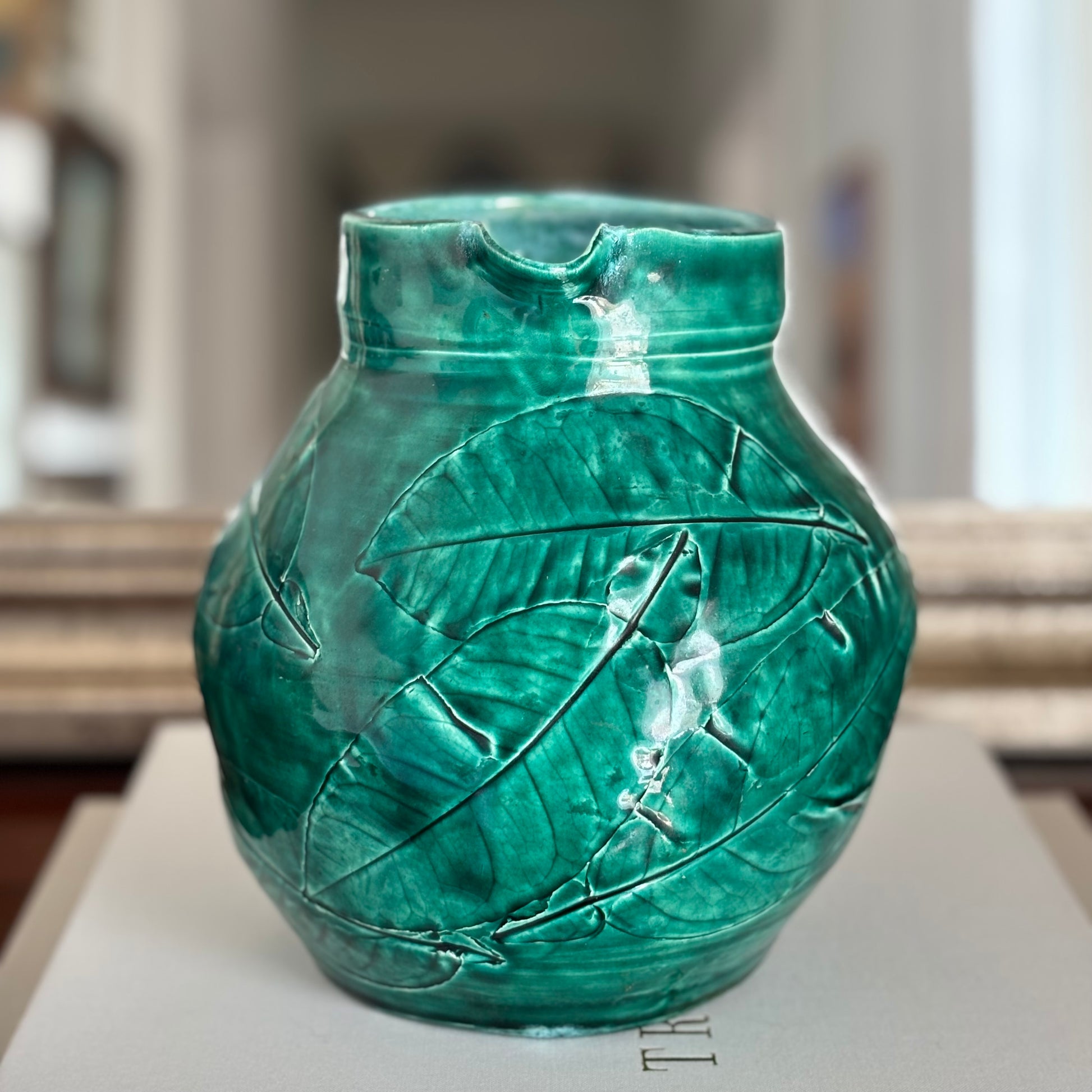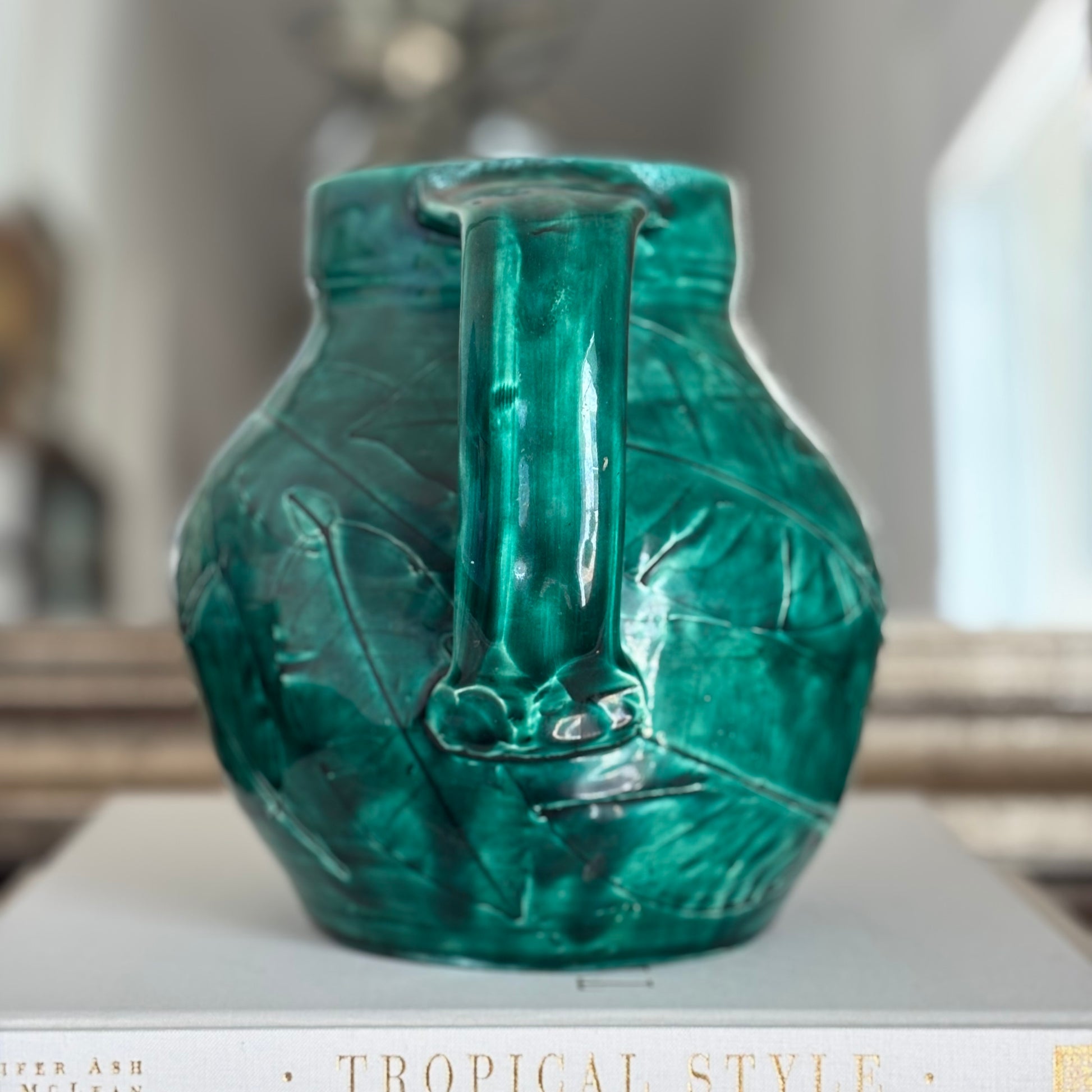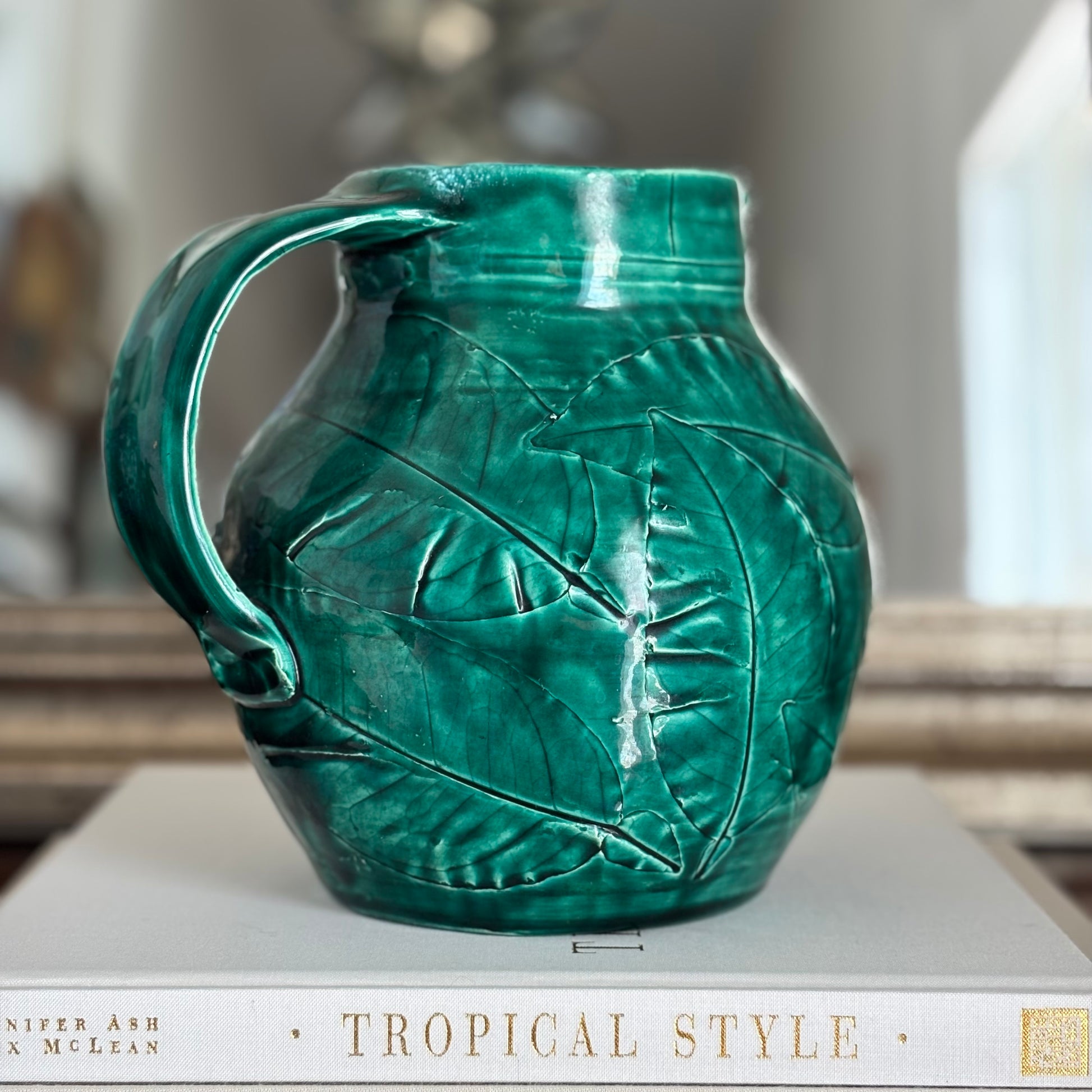 This handmade ceramic green pitcher features detailed leaf motifs that bring a touch of nature into your home. In beautiful condition.