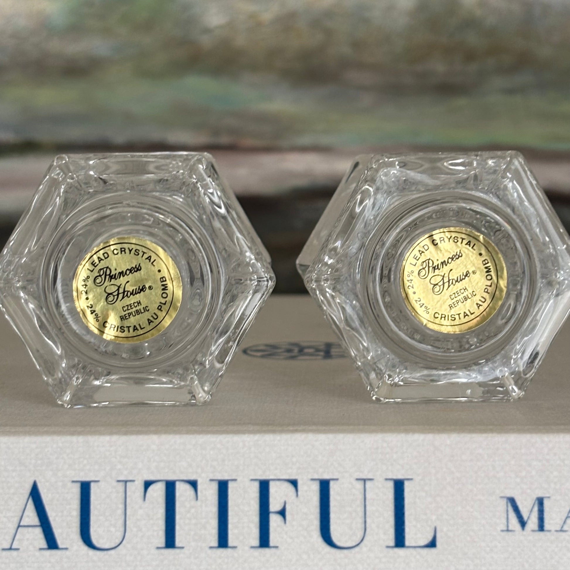 Elevate your table setting or home decor with this distinguished pair of vintage taper candle holders, crafted from 24% lead crystal by Princess House. Manufactured in the Czech Republic, these pieces are in beautiful condition.