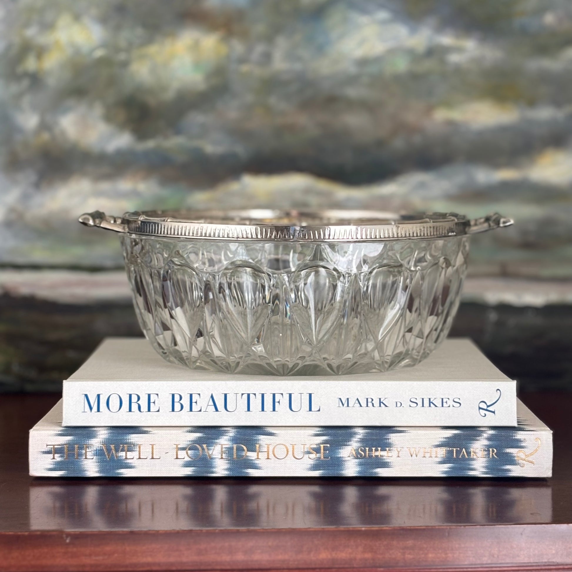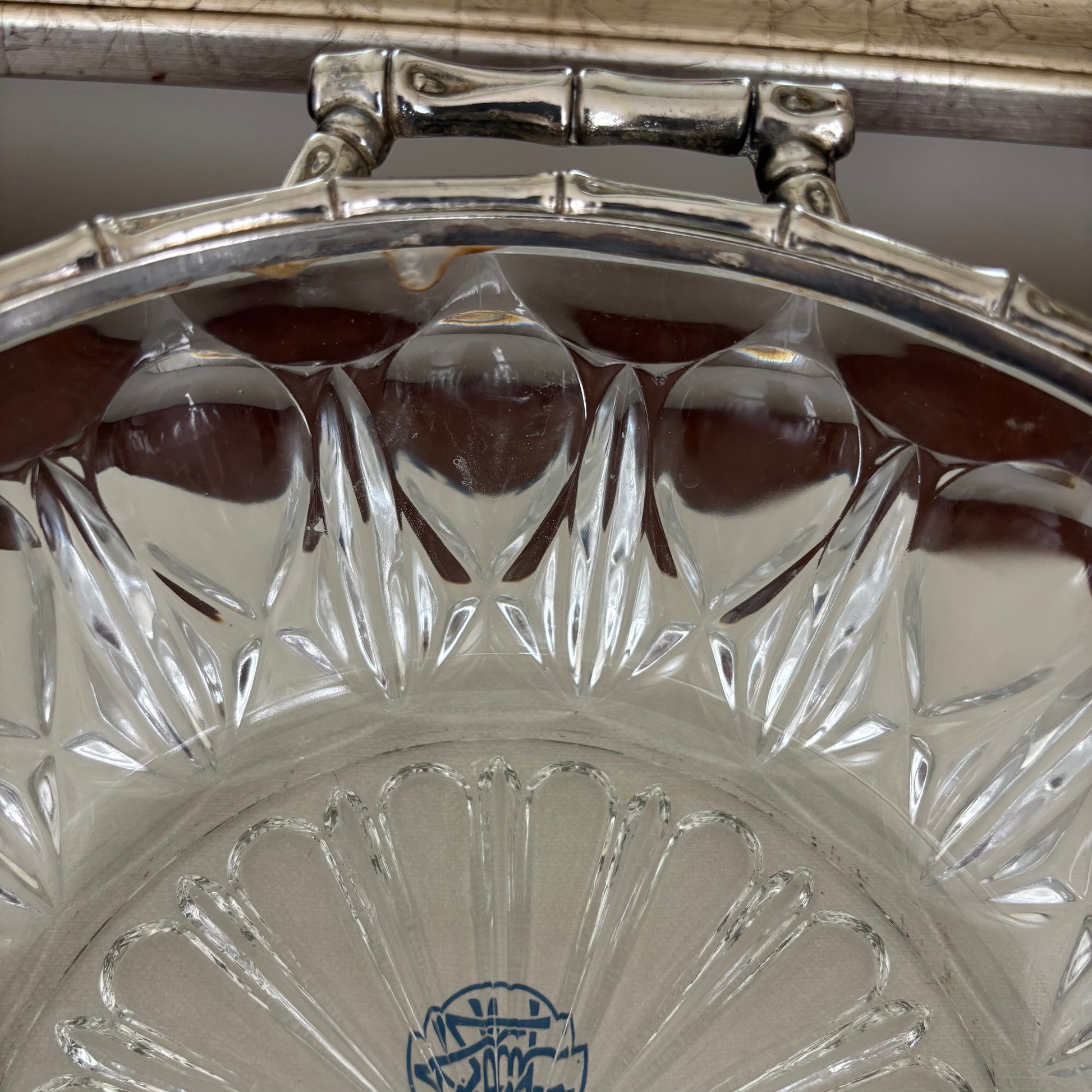 Vintage Glass Bowl with teardrop pattern. Silver plate bamboo rim and handles marked Italy. In vintage condition, wear along inside rim of bowl and a small spot in silver on outside. See photos.