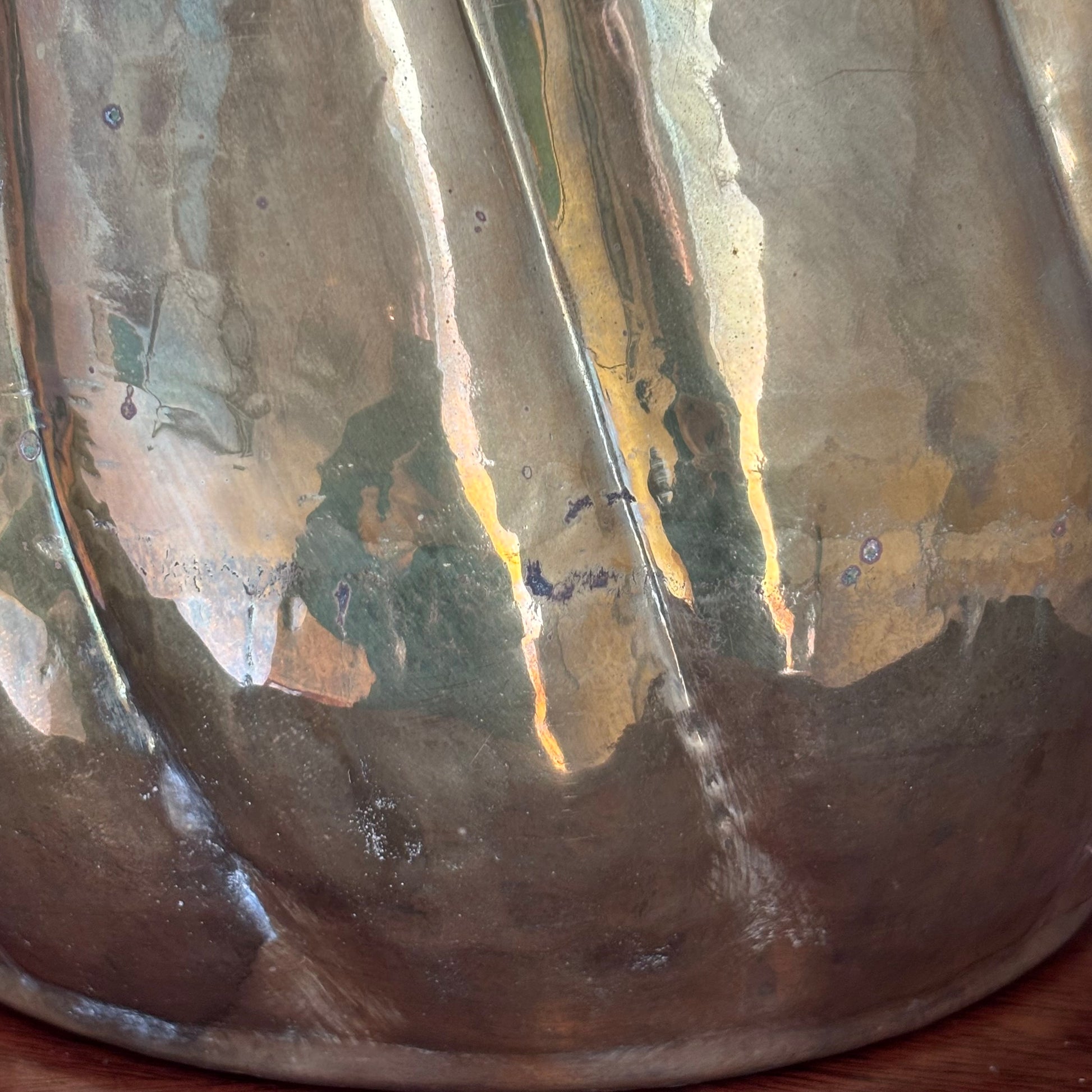 This large vintage hammered brass planter, expertly handcrafted in India, features a scalloped edge. A few visible spots and imperfections are present adding to the vintage charm.