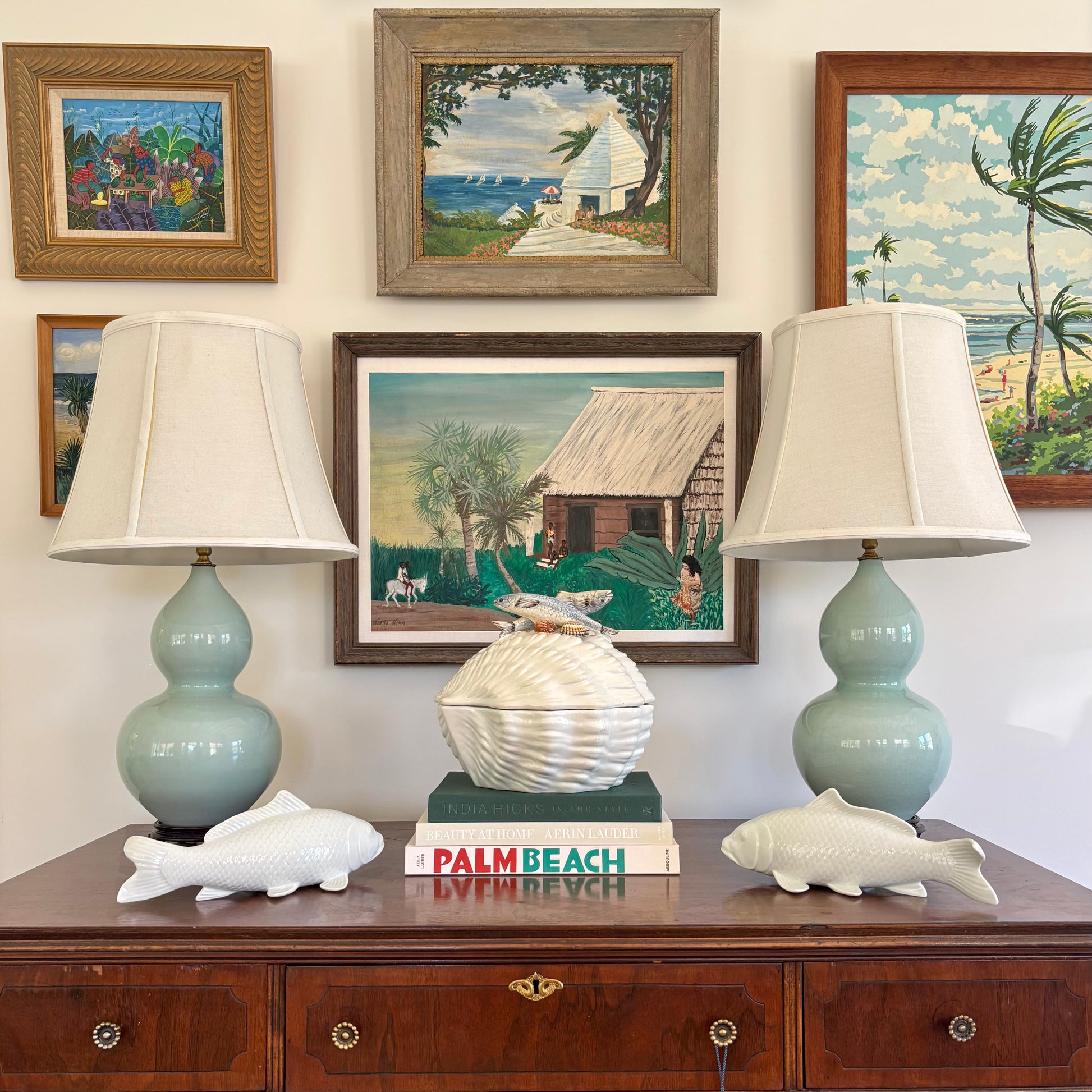 This vintage pair of white porcelain koi fish by Andrea by Sadek, made in Japan, are in beautiful condition and add a timeless touch to any home decor. They have the slightest bit of blue in their glaze.