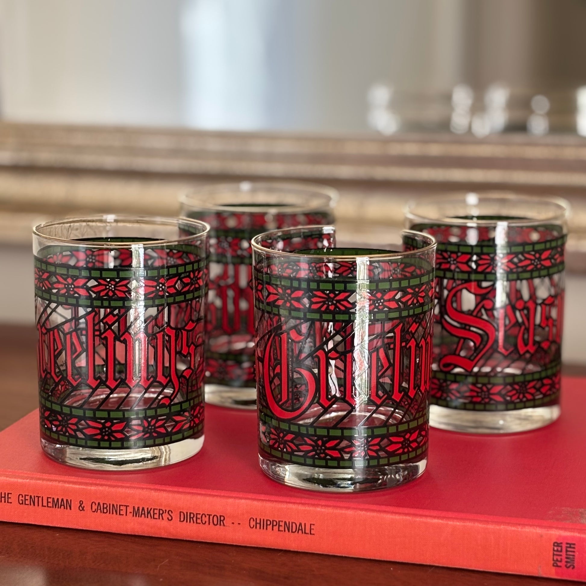 Set of four vintage glass tumblers with Season's Greetings in stained glass style made by Houze. Festive in red, green, and black with a gold rim. In perfect condition.