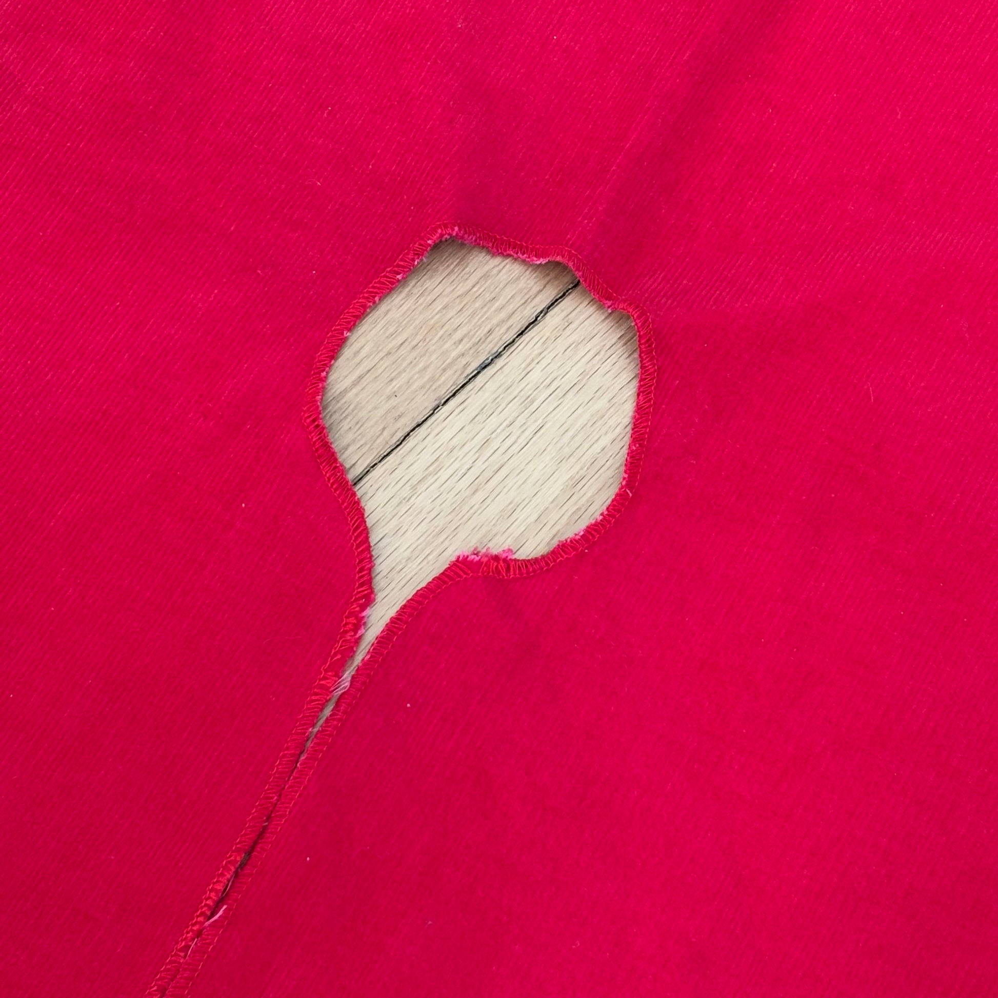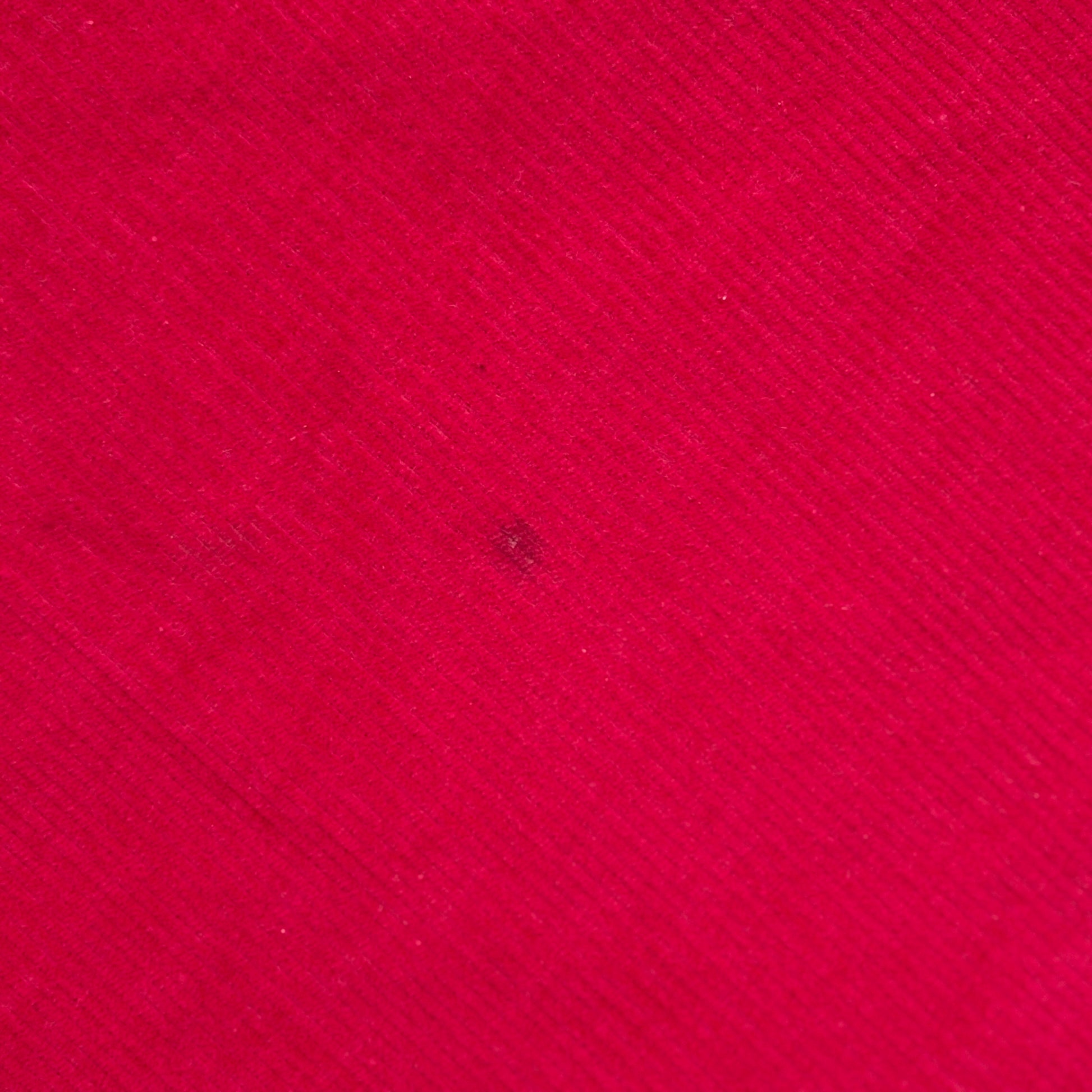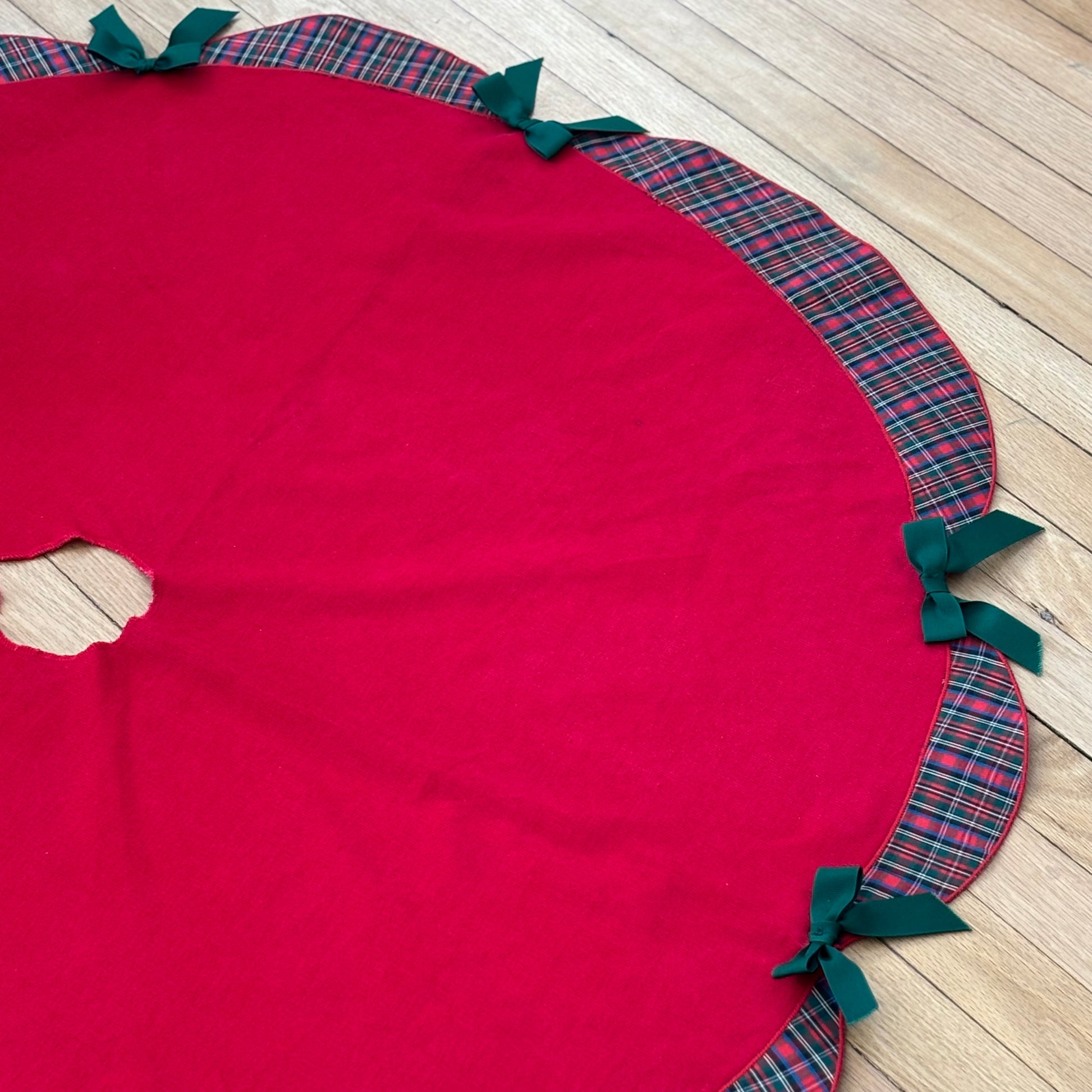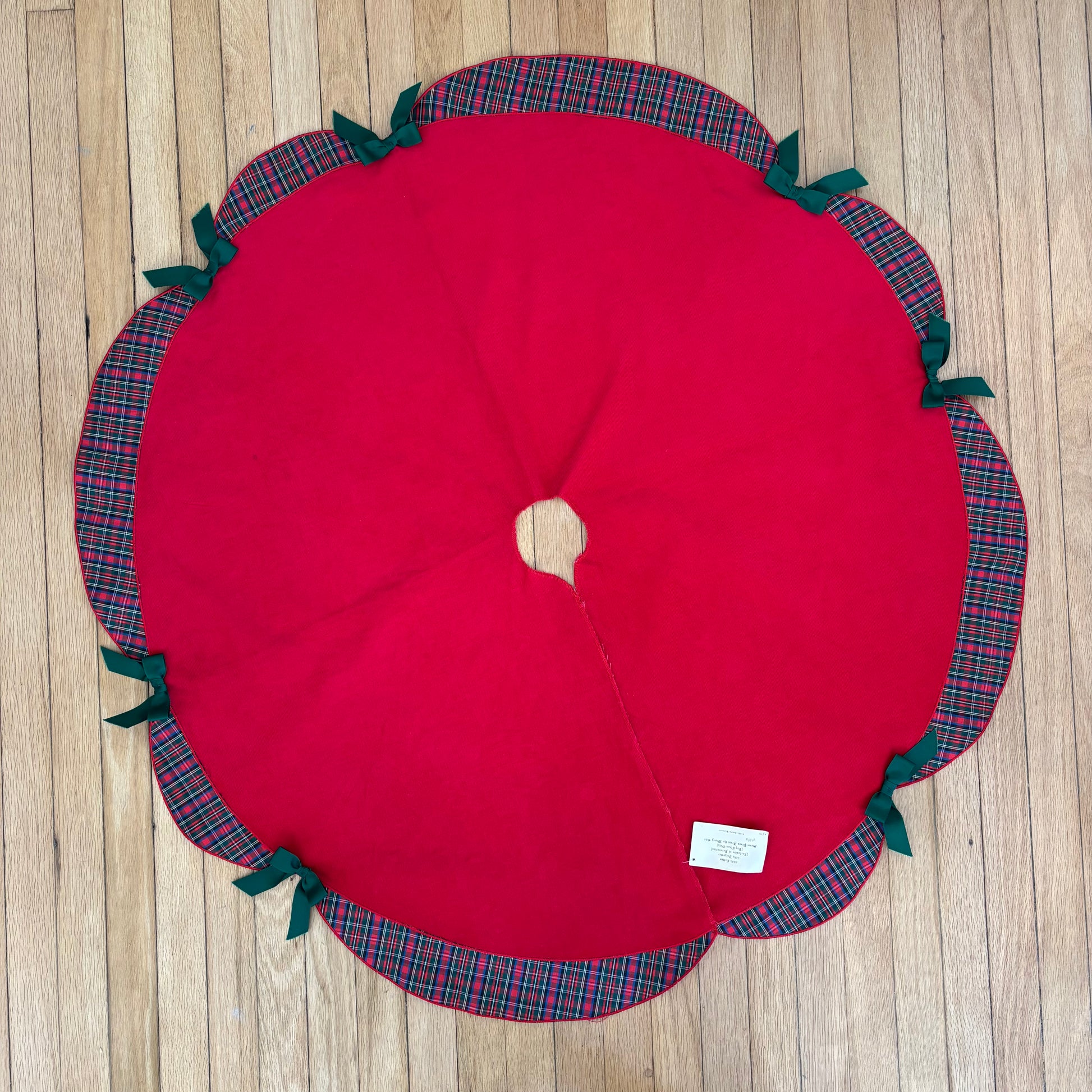 Red corduroy and plaid scalloped tree skirt with green bows. This skirt has the original tag from 1985. In beautiful condition overall, one small stain, see photos.