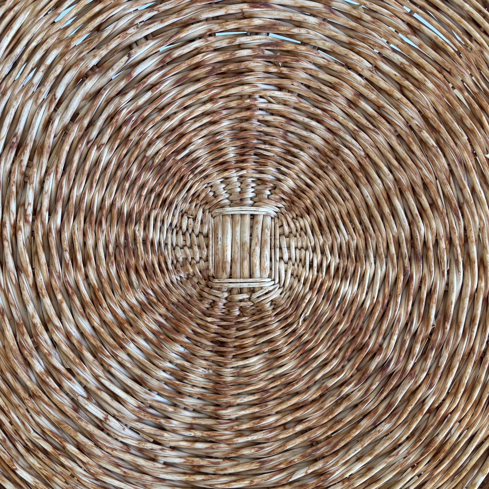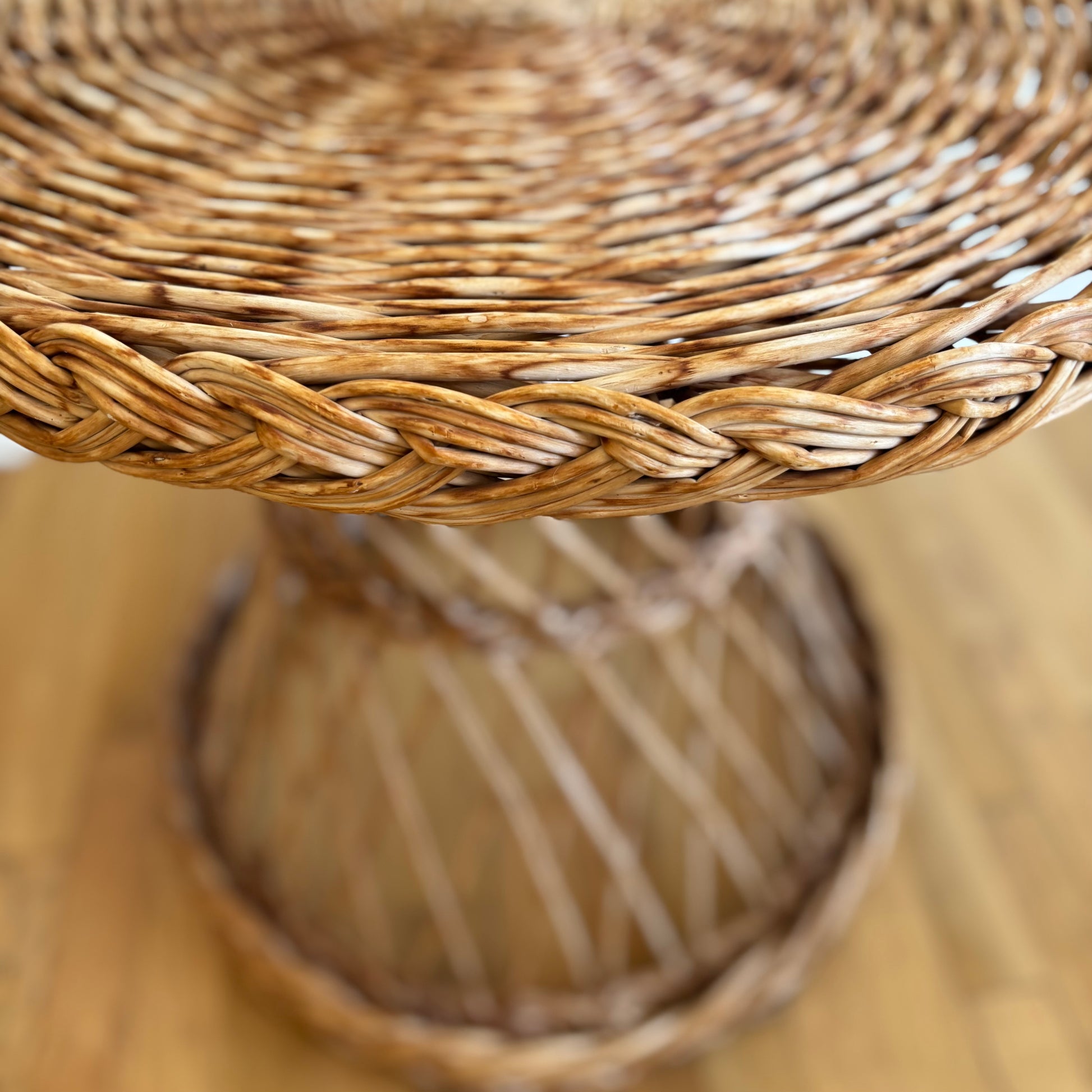This vintage braided wicker hourglass side table brings a touch of warmth and classic style to any room. The unique hourglass shape adds visual interest, while the warm honey color adds a cozy touch. Top of the table is not level, but adding a tray or stack of books provides a level surface. Local pick up or contact for shipping cost.